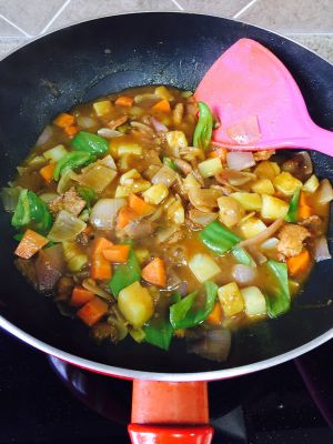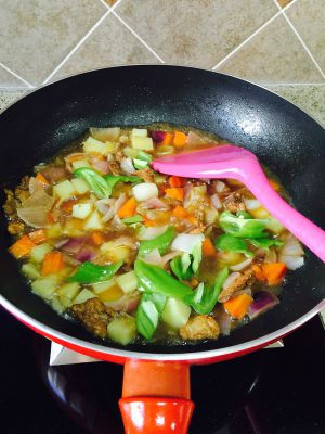 加水做开,改小火,待胡萝卜和土豆软了,下入尖椒