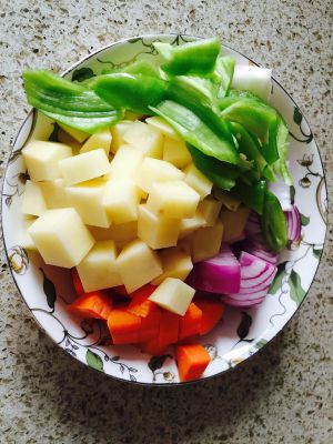 土豆、胡萝卜、洋葱切块,尖椒切片