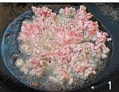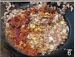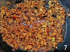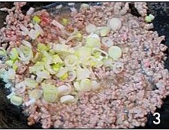 油大火烧热后,加入肥瘦混合肉馅,迅速翻炒,煸出油,肉变色。