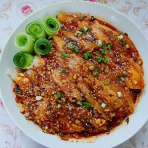 佐料:用一个碗盛着,加盐,白糖,鸡精,酱油,醋,花椒油(面),红油,蚝油,蒜蓉(这个多放点),香油,(我突发奇想加了一点蒸鱼豉油,味道也是不错的),这些佐料全部搅拌好,炸好的花生米撒在肉上(我忘撒了),把佐料均匀的淋在肉上,撒上一些葱花!大功告成,吃饭吧……