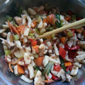 然后倒入丁丁面,翻炒。即可出锅(也可放肉炒)