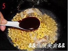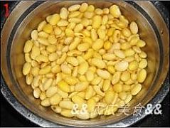 把黄豆(连泡黄豆的水)倒进锅里,加入2汤匙的海鲜酱,水的分量要差不多没过材料;