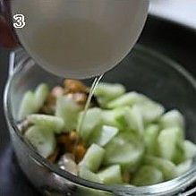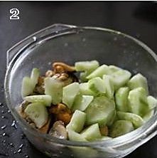 将淡菜肉和切成滚刀块的去皮黄瓜拌好;