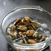 将淡菜烧熟后剥壳,用肉迅速在事先准备好的冰水中过一下;