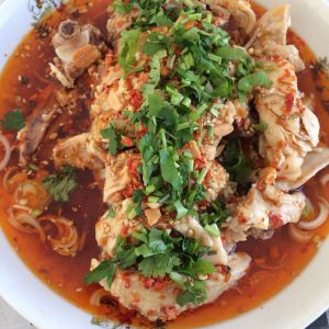 最后把汁浇到鸡腿上在浇辣椒油,放上花生碎,香菜末就可以了