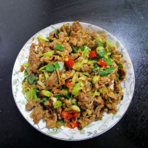 倒花椒油,用姜沫炝锅后放入羊肉厚片爆炒