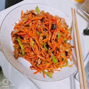 放入之前备好的熟里脊肉和三种蔬菜丝翻炒至蔬菜断生