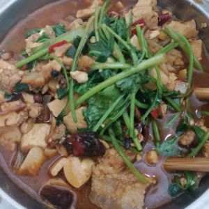 锅里烧油,下葱姜大料花椒慢火炸香(最好炸完把东西捞出来,吃着顺口)下五花肉煸炒至焦香,将瑶柱带水一起倒进去盖起来煮10分钟,然后放入豆腐。把剩余所有调料除香菜葱花外的都丢进去煮3到5分钟