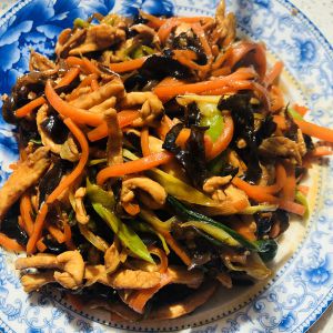 下蒜苗,炒一下,再下胡萝卜和木耳,