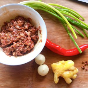 五花肉100克,用料理机打碎(或刀切或买现成均可),一勺生抽、一勺豆粉码五分钟