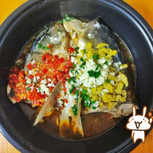 用盐,胡椒粉,黄酒把鱼头里外抹均匀后腌10~15分钟。