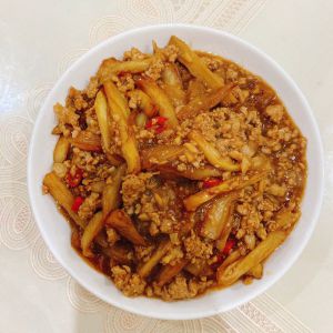 汁水收的差不多的时候,1勺红薯粉和三分之一碗水搅拌均匀倒入锅内勾芡,翻炒均匀即可出锅