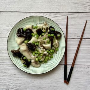准备食材-黑鱼片在菜场已经片好了,回来加盐/淀粉/水抓匀后放少量食用油裹住水分;葱姜切丝;2勺糟卤里加适量鸡精/白糖调味;干淀粉里加少许水调成水淀粉。