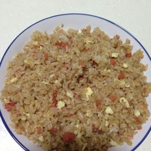 生抽一勺、老抽一勺、少许料酒、少许糖加适量油倒入米饭拌匀。