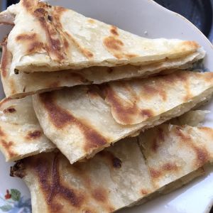 取一块擀薄后撒上盐、葱花,再抹上油酥,按压成饼胚。
