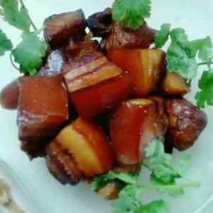 放入焯好的五花肉煸炒出多余油脂上色(如图)喷入少许白酒加入少许南乳,加入葱姜蒜少许花椒,小茴香,茶叶稍许煸炒加入开水,煮沸后加入盐、鸡精调味!放入高压锅二十分钟即可享受美食!