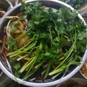 大葱破开切长丝,老姜切片,泡姜切片,泡椒、青红辣椒切长条 ,泡菜头切片,香菇切片,杏鲍菇切条型,竹笋切长条形,香菜去掉根洗净。