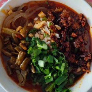 将红薯粉煮熟盛入调好汁的碗里,加肉沫,榨菜,黄豆或者花生都可以啦