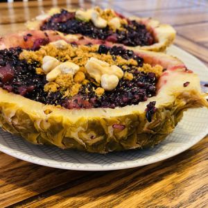 将煮熟的紫米饭放入取出果肉的菠萝中,上锅蒸8分钟,让果味融入米饭中。