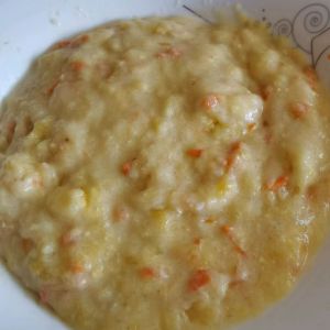 最后锅中放油,先炒胡萝卜扇贝柱的泥,之后放入玉米土豆碎,加入牛奶或者兑好的奶粉,加入盐,和适量的水。全程小火。