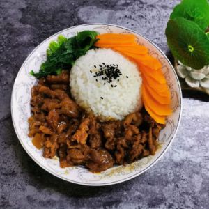 先放米饭,再把肥牛和青菜摆好,撒上黑芝麻,完成