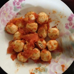 锅烧热,加入少量油,放入西红柿,翻炒,加入番茄酱,放入豆腐丸,加入盐和糖,翻炒一下,就好了!