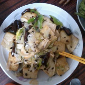 坐锅开火倒入香葱辣油,油发热时,放入麻椒,(由于放入麻椒较多,可以炸的差不多时,把麻椒捞出),放入葱姜蒜末,煸炒出香味,将豆腐贴锅边放入锅内,要不时的掂起来转锅,防止粘锅或者糊了,盐鸡精味精根据自身口味放。当贴锅那面成金黄即可反过来贴另一面了,同样另一半也成金黄色,