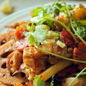 全部炒熟变色后出锅装盘,洒上胡椒粉,有白芝麻洒上更好,洒上几只香菜就OK啦。