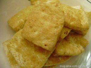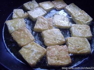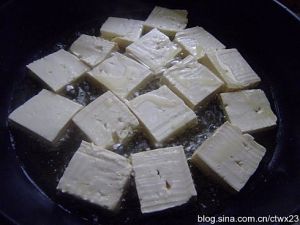 平底不粘锅上火加热,倒入油,油七八成热,逐块放入豆腐块,中小火煎,一面大约要煎五六分钟(不要多翻面,豆腐容易碎,因此一般五分钟以后才去看看下面煎得怎样了,或者从油泡上断定,一般油泡由大到小就差不多了。另外当中的容易煎透,旁边的不易煎透,因此中途需要前后晃动锅子,让油温均匀一点)
