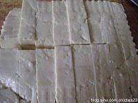 卤水豆腐去包装(表皮的膜撕掉,底部剪四个角便于倒出),横着一切二,然后再切成薄片