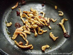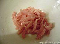 大排里脊肉(切出一小块,其余的冻起来了)切成肉丝放入碗内,加少许盐、味精、淀粉、水拌匀