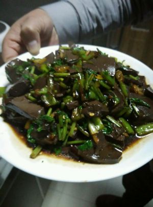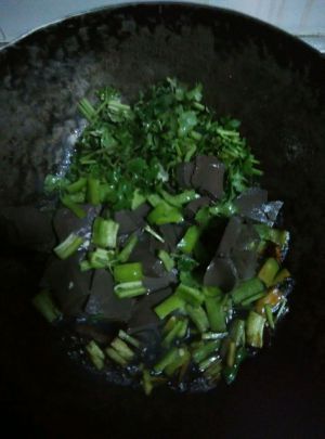 倒入羊血、辣椒、香菜段,大火爆炒至辣椒变深绿色。