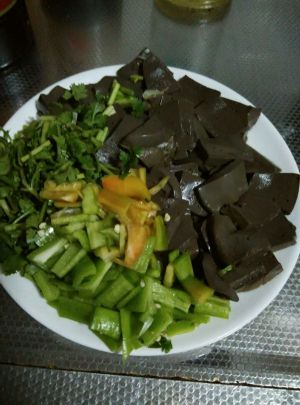 羊血切2cm左右大小,0.5cm厚的小片儿;青辣椒、香菜切1cm大小的小段儿