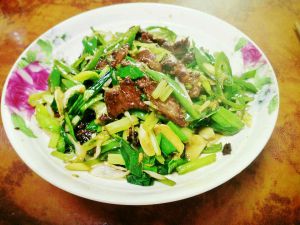 油热后放入牛肉翻炒1分钟后放入适量盐,继续煸炒至水分蒸发