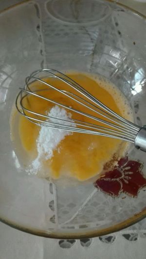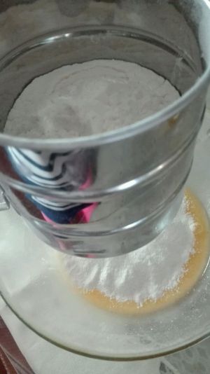 将面粉,泡打粉,小苏打过筛放入搅好的蛋液中。