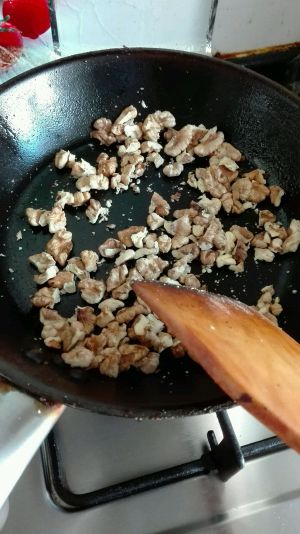 炒核桃~生核桃仁一定要用平底锅小火炒香,炒制的过程中用锅铲将大块的核桃仁铲碎,晾凉备用。