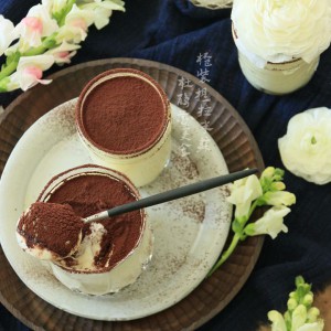 再倒入马斯卡彭奶油糊,然后将杯子口用保鲜膜封住,放在冰箱冷藏6个小时以上或是过夜。吃之前筛些可可粉在上面就可以啦!喜欢抹茶口味的,也可以筛上抹茶粉。
