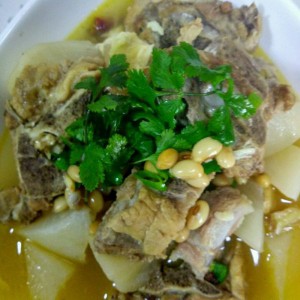 倒入萝卜排骨在电饭锅,可以放100克洗净的黄豆,加水1碗,加一点盐,开始炖排骨汤了