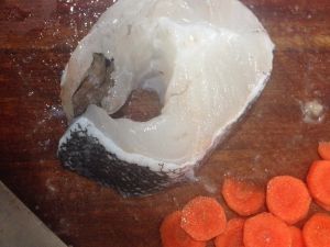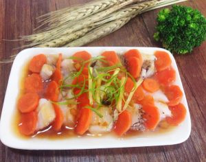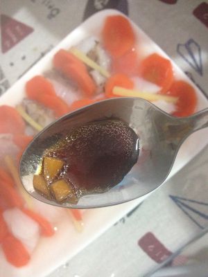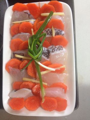 摆在盘子里,放入姜丝,葱结,料酒一点点即可。锅里水烧开转小火,放入鳕鱼蒸10分钟左右。