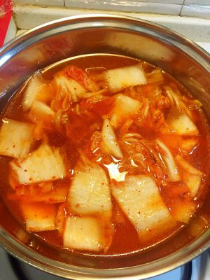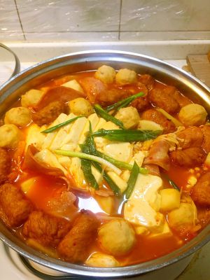 加水,待水开后,依次加入一大勺韩国辣酱、黄豆芽、金针菇、土豆、豆腐,大火烧开,小火慢炖,等土豆熟了没烂前,再加入贡丸、甜不辣、方腿和年糕。
