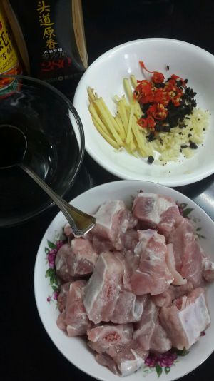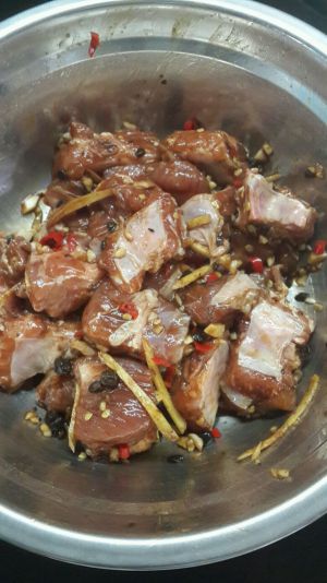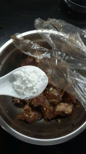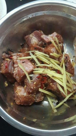把酱汁与排骨抓匀,然后放入姜丝稍微拌下。全过程建议戴上一次性手套来做。