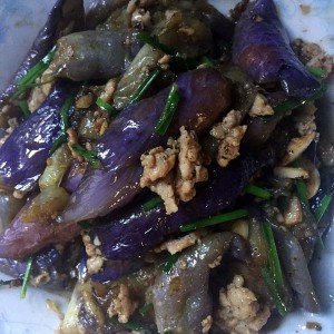 2.把多余的油倒掉,锅内不用到油了,因为锅底还很油,放入大蒜末炒香,倒入肉末翻炒一会,再倒入刚才的茄子翻炒一下倒点味极鲜,盐,白糖就可以出锅啦!