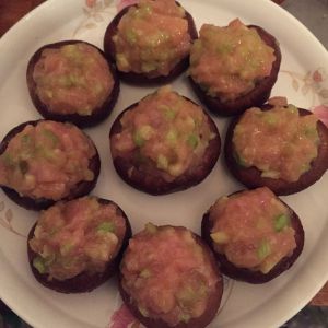香菇,芹菜清好,香菇去心,芹菜切碎,步骤,肉末➕切好的芹菜➕一个鸡蛋➕盐➕鸡精搅拌,搅拌好之后把肉馅放到去好心的香菇里,摆盘,然后蒸15分钟。
