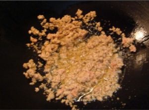 锅中放油,开火烧热,下入肉末、姜末、蒜末和豆瓣酱,炒香。