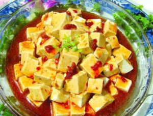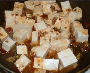 加入适量清水和酱油、盐、白糖、味精,放入豆腐,轻轻翻炒片刻。