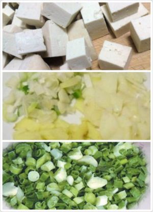 豆腐切小方块,姜、蒜拍碎切成末,小葱切成葱花。
