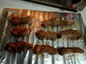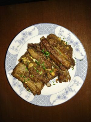 烤肉:烤箱上下火200℃,预热5分钟。排骨在锡纸摆齐(纸上刷点油),洒孜然,椒盐,入烤25分钟。取出翻面,再洒调料,加蒜沫葱花,入箱烤20分钟。
