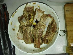 腌制:选猪肋排中段,清水泡半小时,洗净。上述调料若干,加红酒,生抽,用把餐叉,边搅拌边再肉上戳些小孔。覆膜,冰箱冷藏,腌制4小时以上。