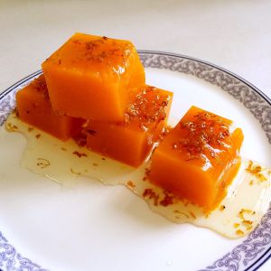 取出凝固的南瓜糕,用小刀沿模具边轻轻划一圈,使南瓜与模具之间有空气进去,方便倒扣,切成块状,食用时淋上糖桂花!完美!
