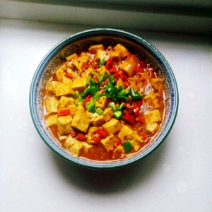 把食材都准备好,老豆腐切成块状,尽量切小一点,红尖椒切成丁状,胡萝卜也切成丁状